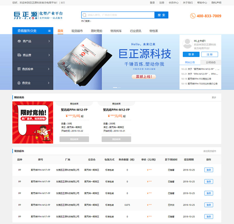 10月21日上午9时,东莞巨正源科技有限公司旗下的产业互联网平台——“巨正源电商平台(www.jzy-e.com)”正式上线。上线当日,巨正源电商平台共计成交380吨聚丙烯产品,客户对该平台的交互界面和功能表示满意。