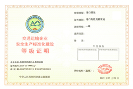 日前,巨正源所属盛源石化、鸿源码头正式获得由国家交通运输部颁发的“交通运输企业安全生产标准化建设一级达标企业证书”,这标志着盛源石化、鸿源码头安全生产管理迈上标准化、规范化的新台阶。